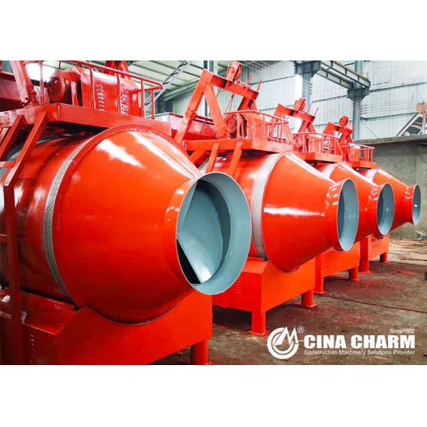The mixing mechanism consists of a mixing drum, a supporting wheel and a transmission system. The mixing drum is the working part of the mixer. The mixing drum is double-cone. There are two pairs of high and low pieces welded in the inside of the drum. They are arranged crosswise and form a certain angle with the axis of the mixing drum. When the mixing drum rotates, the blades lift the material while falling. It also makes the material move back in the axial direction, so the mixing movement is relatively strong, and the homogeneous concrete can be reached in 35-45 seconds after mixing. Inside the discharge cone of the mixing drum, a pair of discharge blades are welded to change the rotation direction of the mixing drum, and the concrete is pushed from the bottom blade to the discharge blade and discharged out of the drum. The mixing drum is supported by four supporting rotations, and the mixing drum is rotated by the gear ring driven by the motor through the reduction box, so it can still work reliably in foggy and rainy weather. The forward and reverse rotation of the shaking drum is realized by motor commutation.